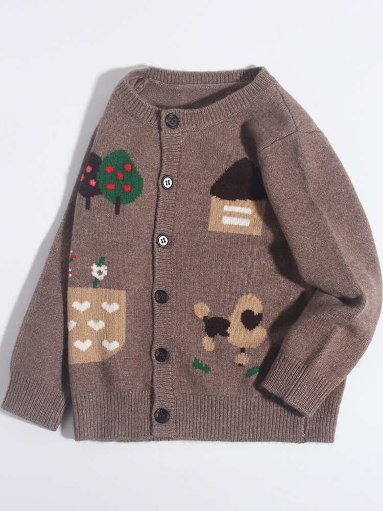 Style: Button-Down Cashmere Cardigan Sweater for Kids Design: Playful countryside theme featuring trees, houses, crops and a puppy; ribbed neckline,... more info