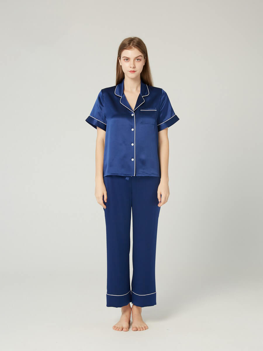 Luxurious women's two-piece pure mulberry silk pajama set. Rich and mysterious navy blue with contrasting burgundy silk trimming. Crafted from 100%... more info